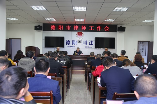 2018年3月2日,德阳市司法局、德阳市律师协会召开全市律师工作会议。市律协正副会长、副秘书长、各律师事务所主任,及各县(市、区)司法局、市司法局经开区分局分管领导参加会议。市司法局党委书记、局长陈春平,市司法局党委委员、机关党委书记、市律师行业党委书记廖德智出席会议。