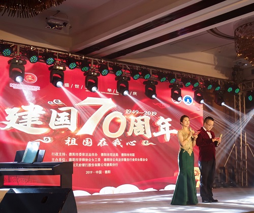 为深入贯彻落实《关于隆重庆祝中华人民共和国成立70周年广泛组织开展“我和我的祖国”群众性主题宣传教育活动的通知》,2019年7月25日,由德阳市依法治市办、德阳市司法局、德阳市妇联提供行政支持,德阳市律协女工委、市公共法律服务行业妇女联合会联合主办的“祖国在我心,庆建国70周年”文艺活动在德阳市汉瑞酒店圆满举行。