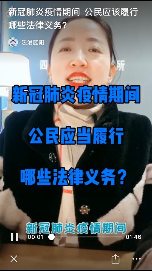 四川润坤律师事务所党支部书记、主任黄凤玲。疫情发生以来,她在加强自我防护的同时,切实履行职责使命,主动作为。不仅勇当志愿者深入社区张贴公告、分发口罩、防疫检查、入户宣传,还利用空闲时间结合抗击疫情时期下社会关注的热点问题,录制抖音作品,在线为居民群众宣传法规政策,解答法律疑难。在抗击疫情时期先后她发布了《新冠肺炎疫情期间公民应当履行哪些法律义务》、《新型冠状病毒肺炎对企业和劳动者有哪些影响》等小视频,这些小视频及时有效地解答了群众的法律疑难,引导群众坚定信心、增强科学防控疫情能力,用实际行动积极投身防控“疫”线,确保疫情防控期间法律服务不掉队、不缺位、不断档。截止2月26日,黄凤玲律师共计录制29个抖音作品,浏览量破千。