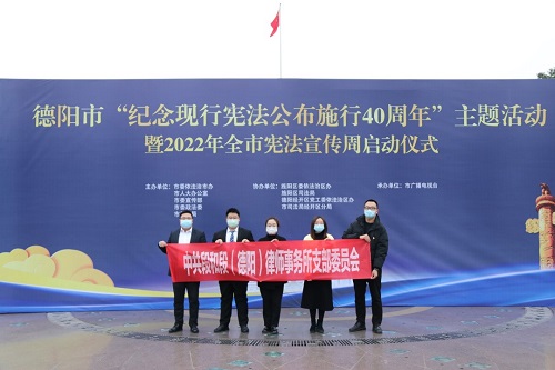 市律师协会印发《2022年“宪法宣传周”实施方案》,积极组织律师参与“宪法宣传周”系列活动。12月5日下午,德阳市2022年“宪法宣传周”暨“纪念现行宪法公布施行40周年”启动仪式在德阳市文庙广场举行,市律师协会组织20名律师参与《坚持全面依法治国,推进法治中国建设》法治诵读,北京盈科(德阳)律师事务所党员律师詹丽参与《我与宪法同岁》视频展播活动,上海段和段(德阳)律师事务所积极组织律师参加现场宣传活动。活动现场,律师们通过悬挂条幅、发放宣传资料、抽奖问答等方式向广大群众宣传宪法、民法典等相关法律法规,党的二十大精神,习近平总书记关于宪法的重要论述、依法治国理念等。