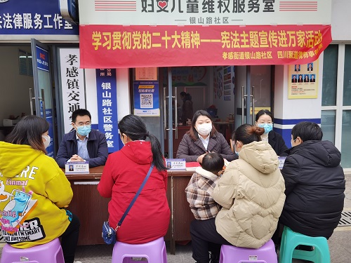 12月4日上午,四川聚道律师事务所联合孝感街道银山路社区开展了“学习贯彻党的二十大精神——宪法主题宣传进万家”活动。四川聚道律师事务所李剑英、刘熙露、罗刚易、陈萍律师参与了本次主题宣传活动。活动中,律师团队向群众发放了宣传资料,赠送了法律书籍100余册,并为咨询群众解答了相关法律问题。