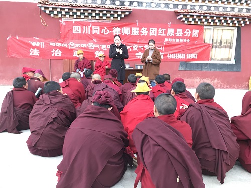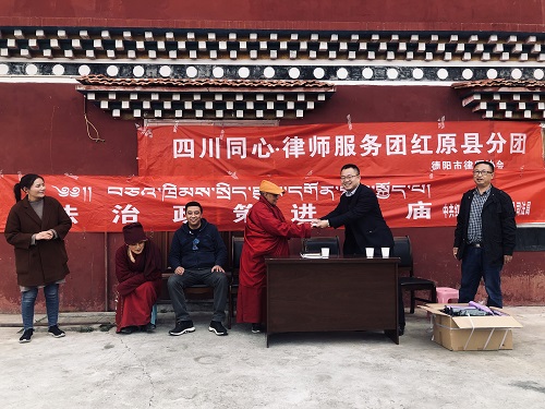 奉献爱心,情注藏区公益。服务分团在提供法律服务的同时,积极开展为藏区送温暖活动。深入该县尼姑寺,大力帮助并积极参与该县寺庙法治宣传教育工作和标准化建设,为寺庙人员讲解宗教法律知识,及宣讲爱国爱教、民族团结等相关知识,2019年同心律师服务团德阳分团第二次赴红原开展法律援助。并向该寺捐赠了法治宣传用品。